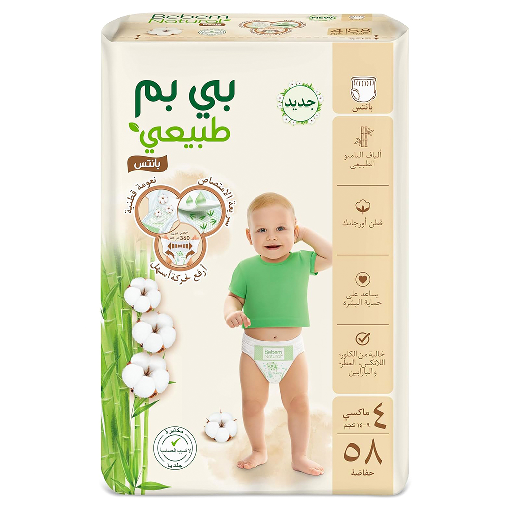 العلامة التجارية : بيبيم ناتشورال النوع : حفاضات اطفال بانتس المقاس : مقاس 3 متوسط الخامة : متعدد الوزن : 6-11 كيلو جرام عدد القطع : 80 قطعة عن المنتج : بيبيم هي الحفاضات الأولى في مصر التي تتميز بمفهوم طبيعي. سطح ناعم وجاف بخلاصة القطن العضوي. خالية من الكلور واللاتكس والبارابين والعطور. منطقة ماصة طبيعية (ADL) بألياف الخيزران الطبيعية.