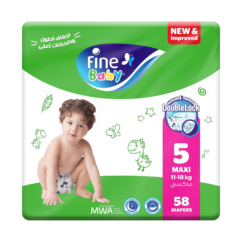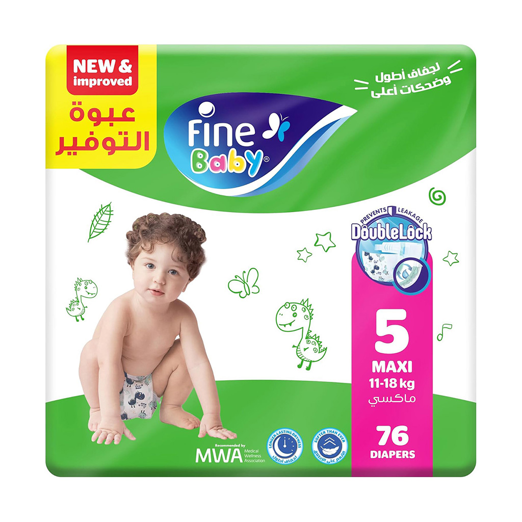 العلامة التجارية : فاين بيبي النوع : حفاضات أطفال بشريط لاصق من الجانبين المقاس :مقاس 5 الوزن : 11 - 18 كيلو جرام عدد القطع : 58 قطعة عن المنتج : آمنة على البشرة الحساسة، ومناسبة للاستخدام اليومي. امتصاص فائق: لا داعي للقلق بشأن التسرب بفضل طبقات الامتصاص القصوى التي تمنع الرطوبة عن بشرة طفلكِ وتضمن لكِ الحماية من التهيج. مصنوعة من مواد لطيفة تجعلها ناعمة علي بشرة طفلك و لتمنح طفلكِ إحساسًا بالراحة طوال اليوم. حماية فعالة من البلل فا هي توفر جفافًا يدوم لساعات طويلة بفضل قوة الامتصاص العالية. تمنح طفلك حرية الحركة وتقلل من احتمالية التسريب. تهوية مستمرة للبشرة تسمح بدخول الهواء لتقليل احتمالية التهيج أو الاحمرار.