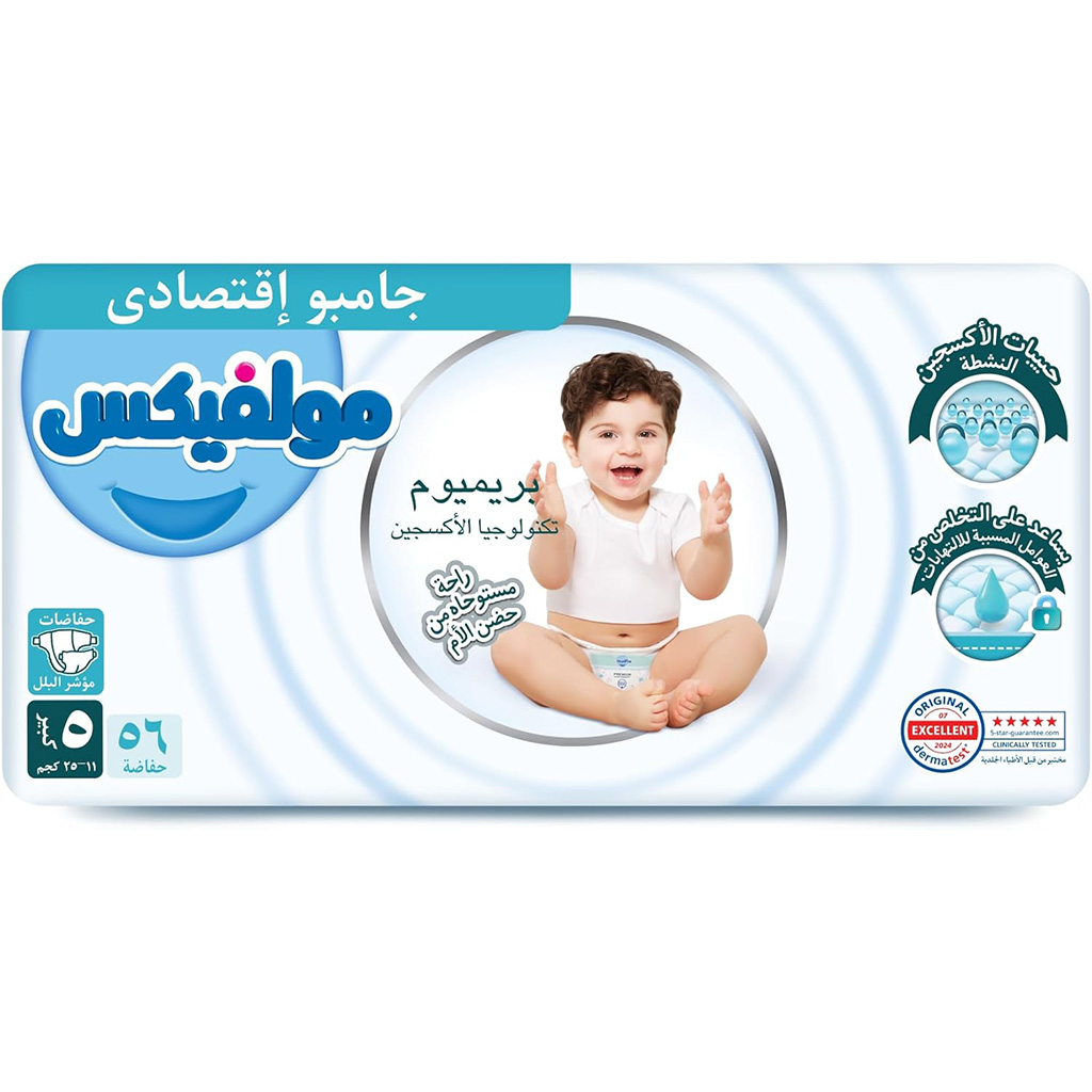 حفاضات أطفال بشريط لاصق من الجانبين مولفكس ، مقاس 5، وزن 11 - 25 كيلو جرام - 58 قطعة | Almorshedy Marts