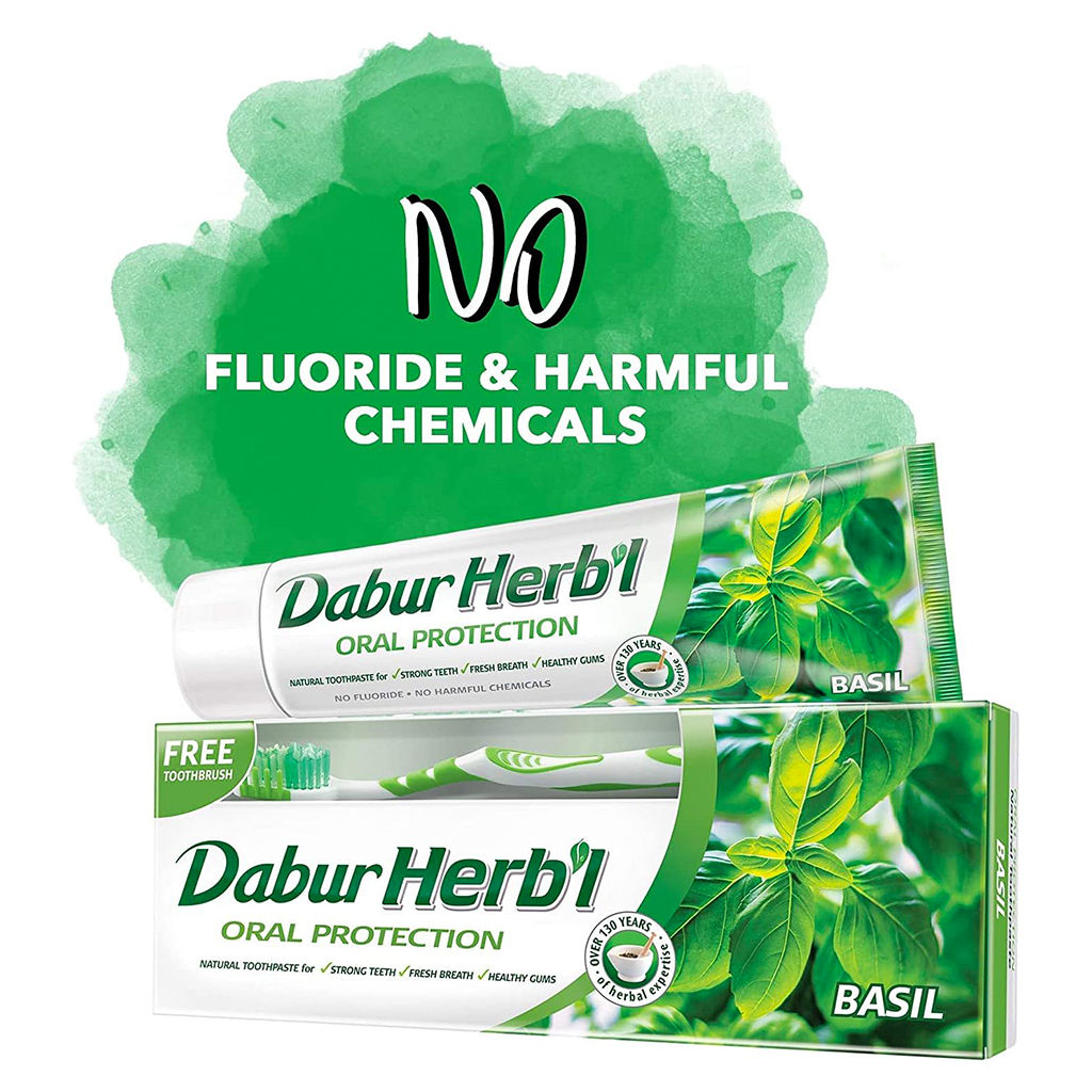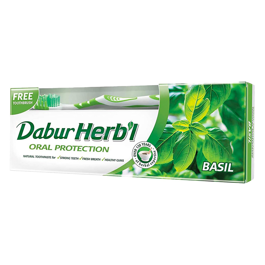 معجون أسنان العشبي الطبيعي بنكهة الريحان دابر، 140 جرام مع فرشاة أسنان هدية