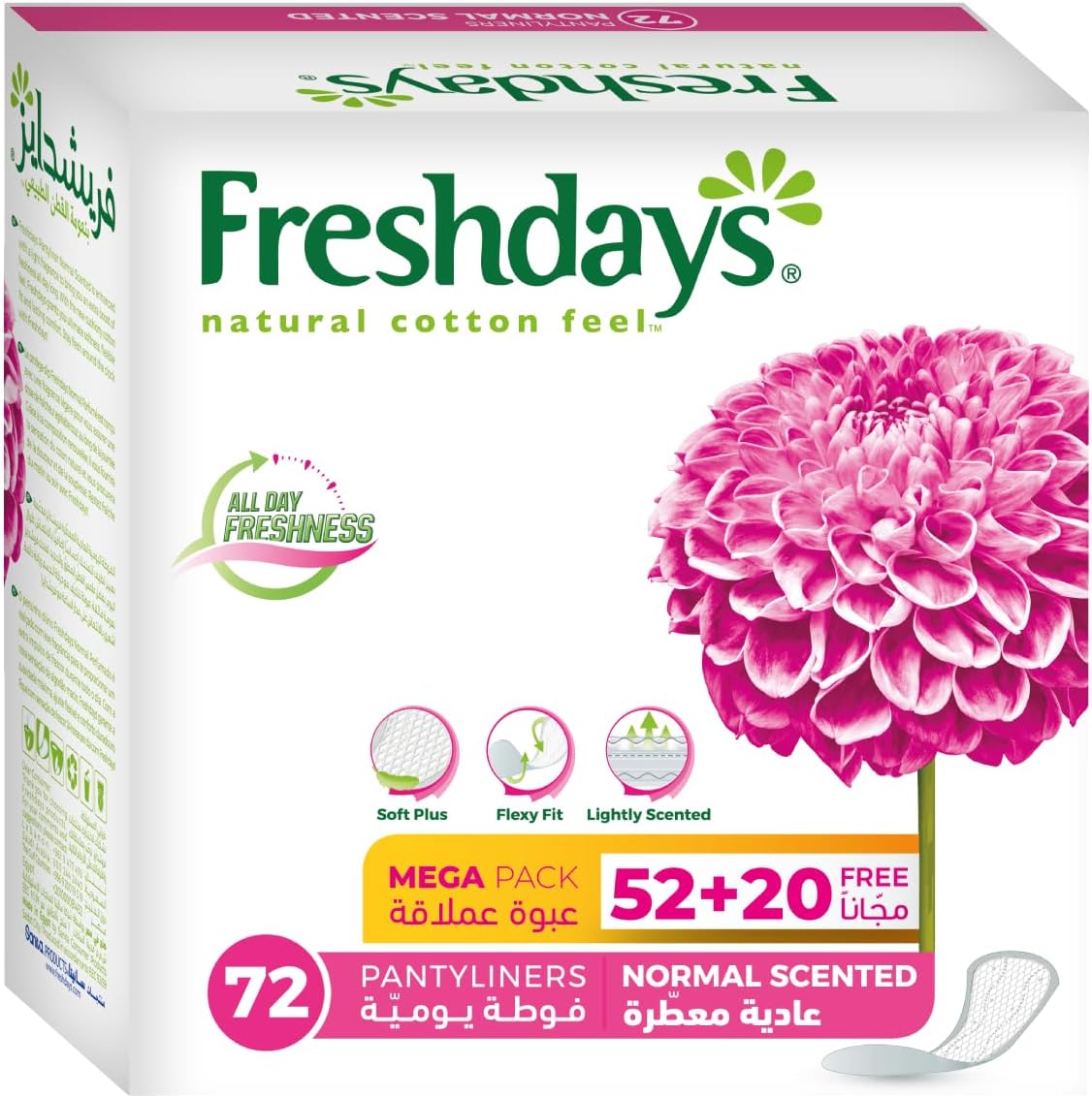 العلامة التجارية : فريش دايز النوع : فوط صحية يومية الخامة : قطن معطر : معطرة عدد القطع : 72 قطعة عن المنتج : فوطه يوميه عاديه معطره ( 52 + 20 ) غطاء علوي بملمس القطن الطبيعي لنعومه مثاليه تصميم محسّن لأقصى امتصاص خلال فترة الدوره طبقه داخليه إضافيه لقوه أعلى وتوزيع متساوٍ للسوائل السيطره على الروائح الغير مرغوب فيها لا يسبب التهاب المهبل حجم عادي