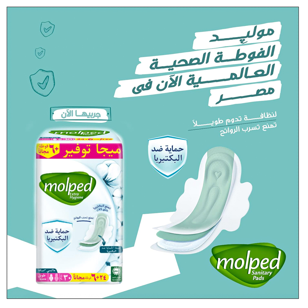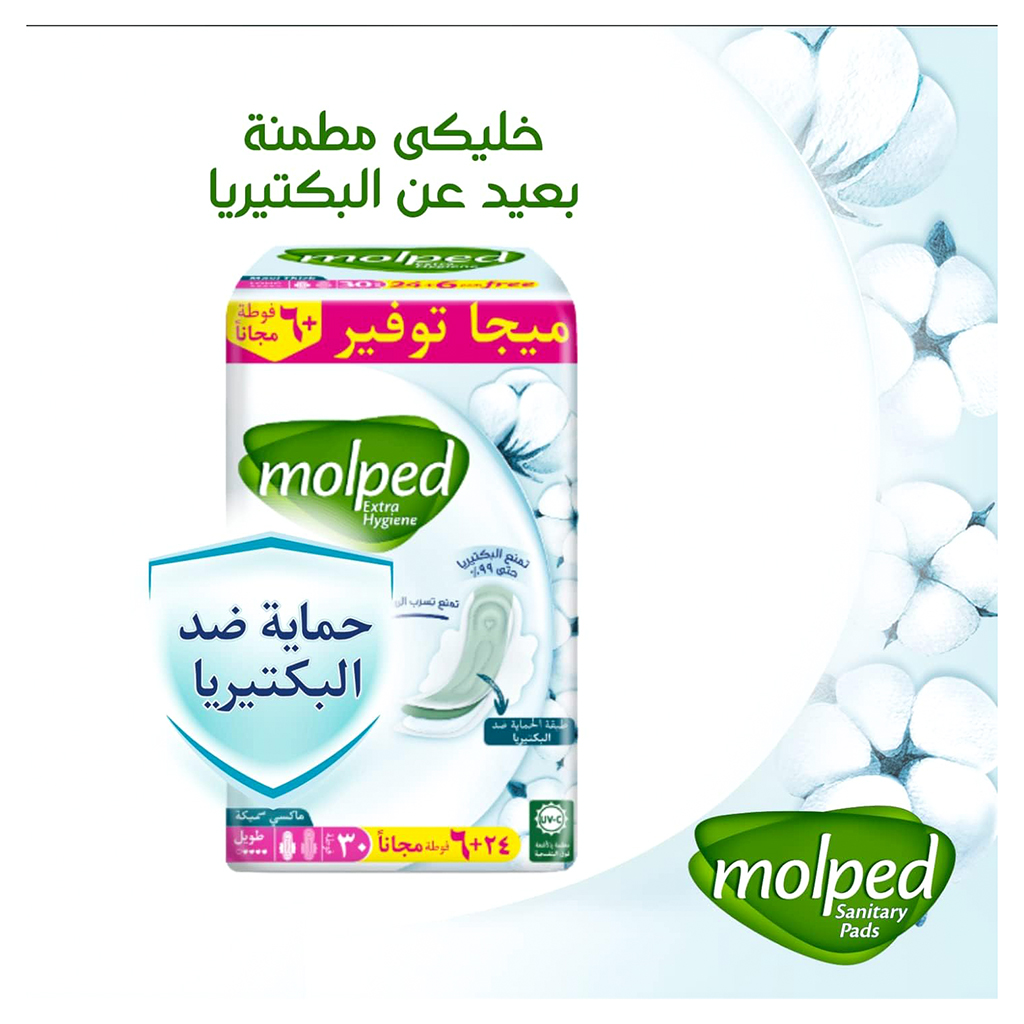 العلامة التجارية : مولبد النوع : فوط صحية مكسي سميكة الخامة : متعدد معطر : عديم الرائحة عدد القطع : 16 قطعة عن المنتج : فوطة مولبد للحماية الكاملة هي الفوطة النسائية الأولى والوحيدة في مصر التي تتميز بتقنية الحاجز ثلاثي الأبعاد لمنع التسرب كما يتم تطهير الفوطة باستخدام ضوء الأشعة فوق البنفسجية أثناء الإنتاج فوط صحية طويلة توفر الفوطة السُمك المثالي للموازنة بين الامتصاص العالي والراحة طويلة