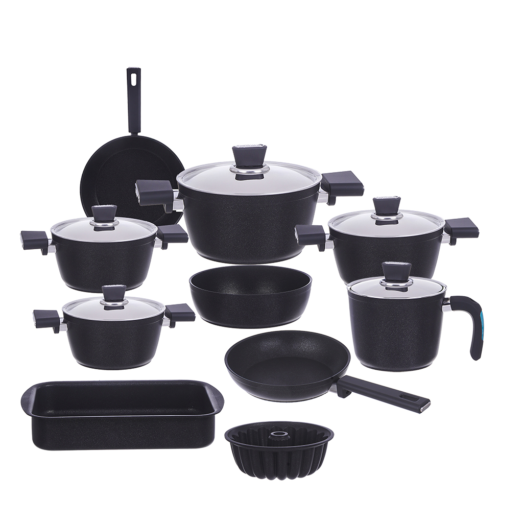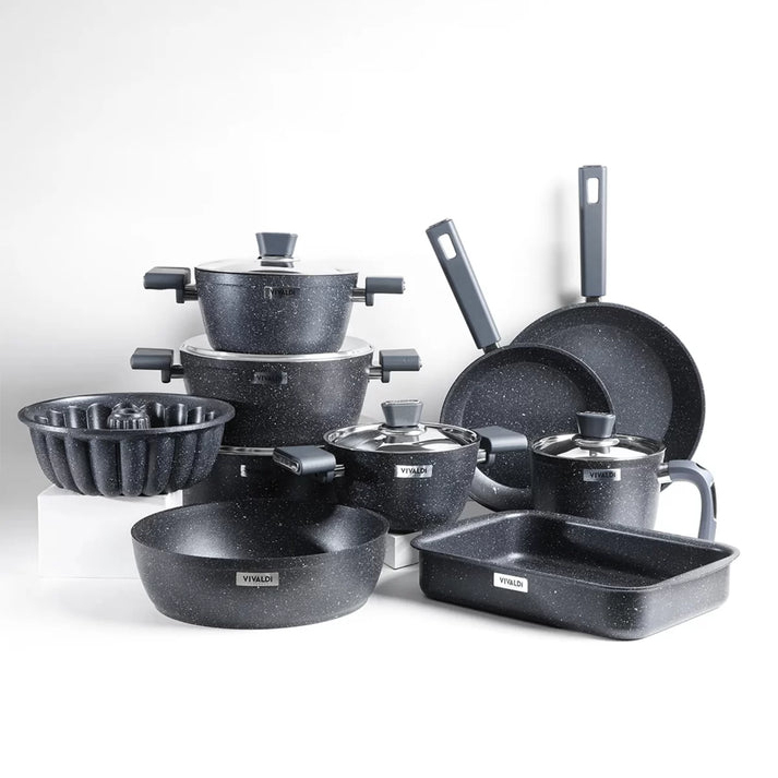 العلامة التجارية: فيفالدي النوع: طقم حلل الخامة: جرانيت اللون: أسود عدد القطع: 15 قطعة يتكون من: حلة مقاس 18 سم حله مقاس 20 سم حله مقاس 24 سم حله مقاس 28 سم مقلاية مقاس 22 سم مقلاية مقاس 28 سم لبانة مقاس 16 سم صنية فرن مقاس 28 سم طاجن فرن مقاس 30 سم بريوش كيك