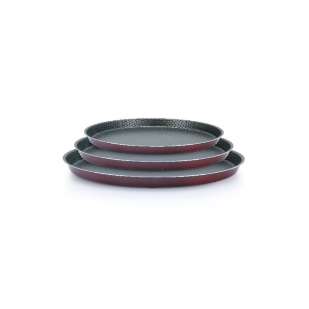 العلامة التجارية: تروفال النوع: طقم صواني فرن البيتزا الخامة: تيفلون اللون: أحمر عدد القطع: 3 قطع يتكون من: صينية مقاس 26 سم صينية مقاس 28 سم صينية مقاس 30 سم