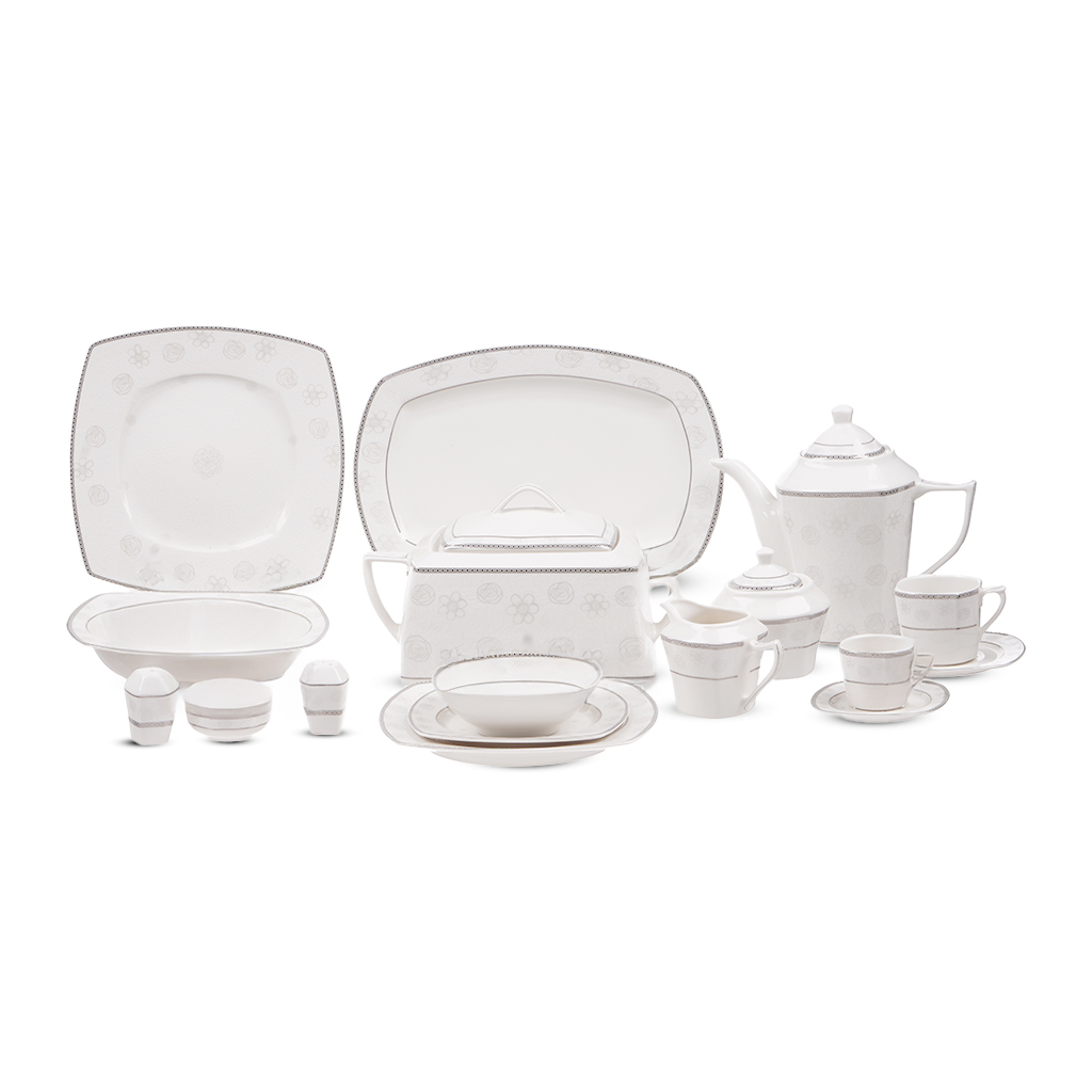 العلامة التجارية: فتحي محمود النوع: أطقم العشاء اللون: أبيض فضي عدد القطع: 72 قطعة الخامة: بورسلين يتضمن 72 قطعة مختارة بعناية: 1 براد بالغطاء 1 سكرية بالغطاء 1 لبانة 6 فنجان شاي مع 6 طبق 6 فنجان قهوة مع 6 طبق 1 بولة شوربة مع غطاء 1 بولة سلطة 6 بولة صغير 6 طبق تقديم عميق 1 سرفيس مسطتيل 1 سرفيس مربع 2 طبق تقديم 6 طبق مسطح 6 طبق عميق وسط 6 طبق عميق صغير 4 بولة صوص 2 ملاحة