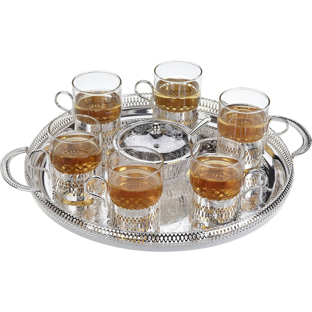 العلامة التجارية: كوين ان النوع: طقم شاي مطلي بالفضة اللون: فضي عدد القطع: 9 قطع الخامة: ستانلس ستيل رقم الموديل: 0/6400 عن المنتج: طقم شاي مكون من 9 قطع مطلي بالفضة 6 أكواب شاي بمقبض صينية وعاء سكر مع غطاء ملعقة