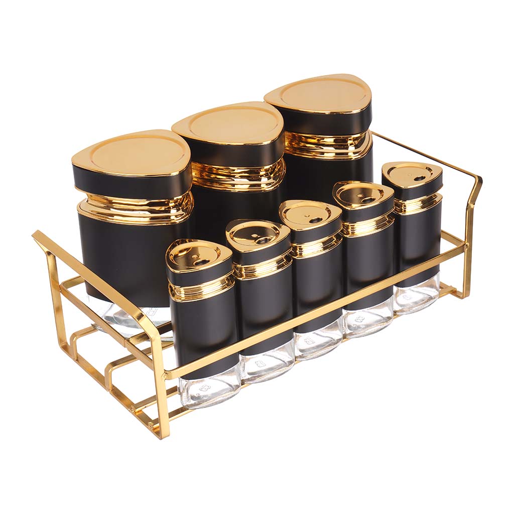 النوع : مجموعة مميزة من علب التوابل مع رف معدني باللون الذهبي