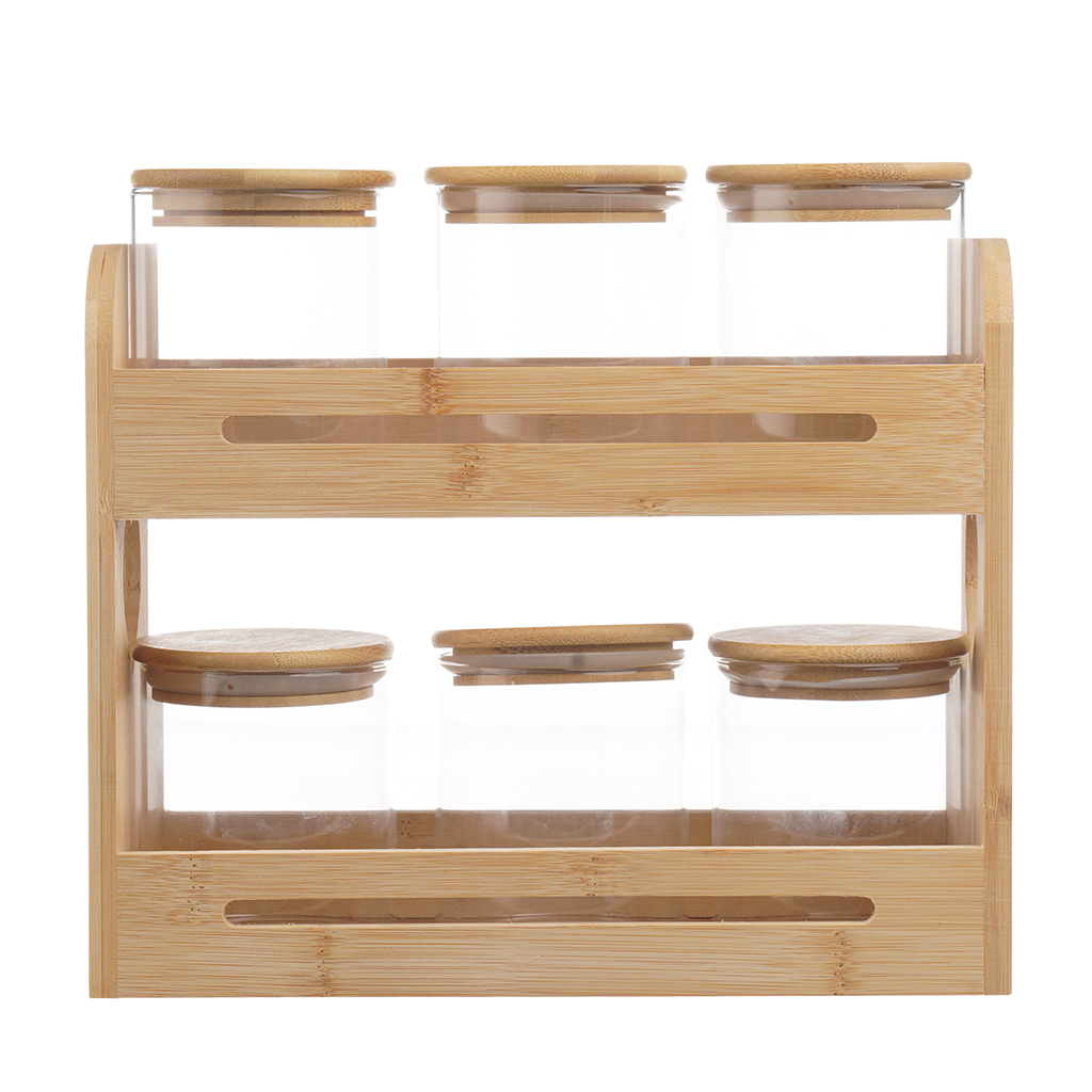 طقم توابل زجاج بحامل خشبي، 7 قطع - شفاف بيج | أسواق المرشدي
