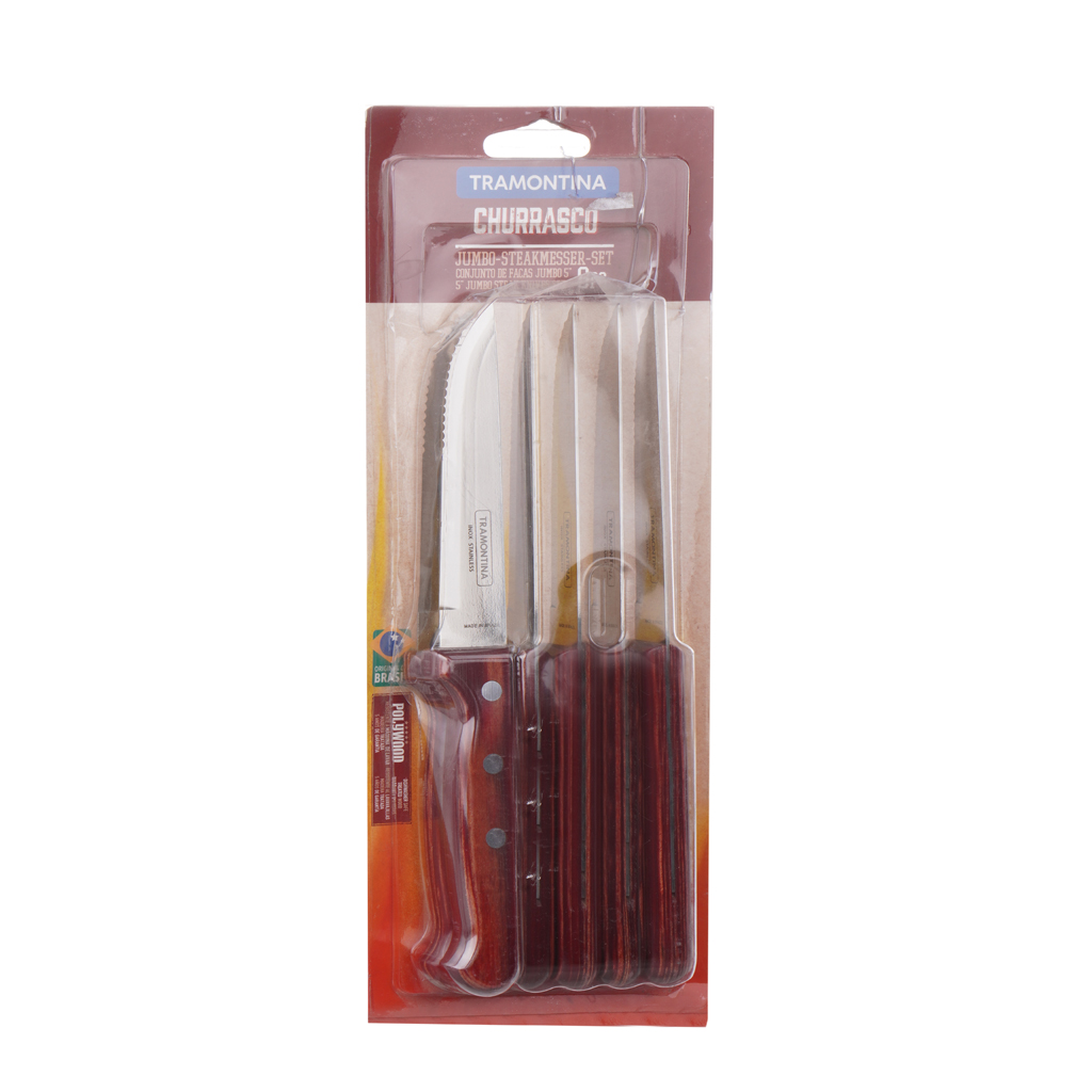 العلامة التجارية: ترامونتينا النوع: طقم سكاكين بيد خشب الخامة: استانليس ستيل اللون: بني المقاس: 24 سم عدد القطع: 6 قطع عن المنتج: طقم سكاكين من الفولاذ المقاوم للصدأ مكون من 6 قطع من ترامونتينا يحتوي طقم أدوات المائدة على 6 سكاكين بمقابض خشبية صُنعت السكاكين من الفولاذ المقاوم للصدأ بمقابض معالجة حرارية من الخشب الرقائقي آمنة للغسل في غسالة الأطباق معالجة حرارية لإضافة المتانة لحافة الشفرات.