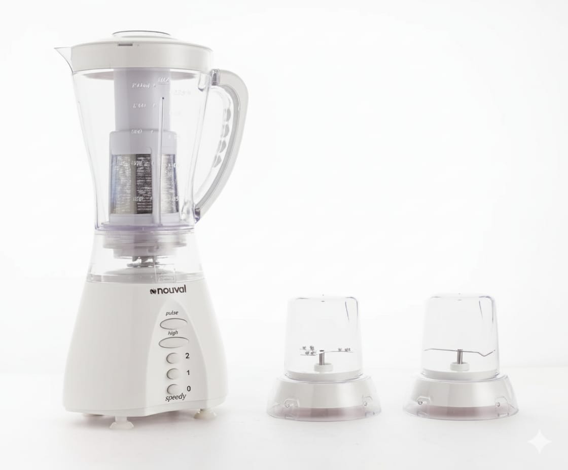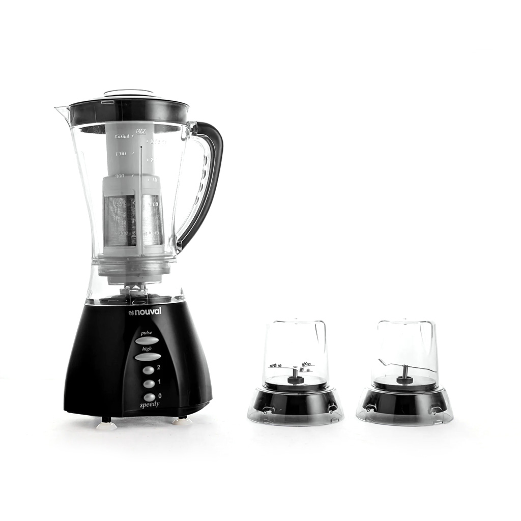 Brand: Nouval Type: Countertop Blenders Color: Black Model Name: Speedy Power: 500 Watts Capacity: 1.5 Liters Number of Speeds: 3 with a pulse button for safety Multi-purpose blender for grinding, chopping, juicing, and mixing food When the blender jug is removed from the base, it automatically shuts off AC 220-240V, 50-60Hz