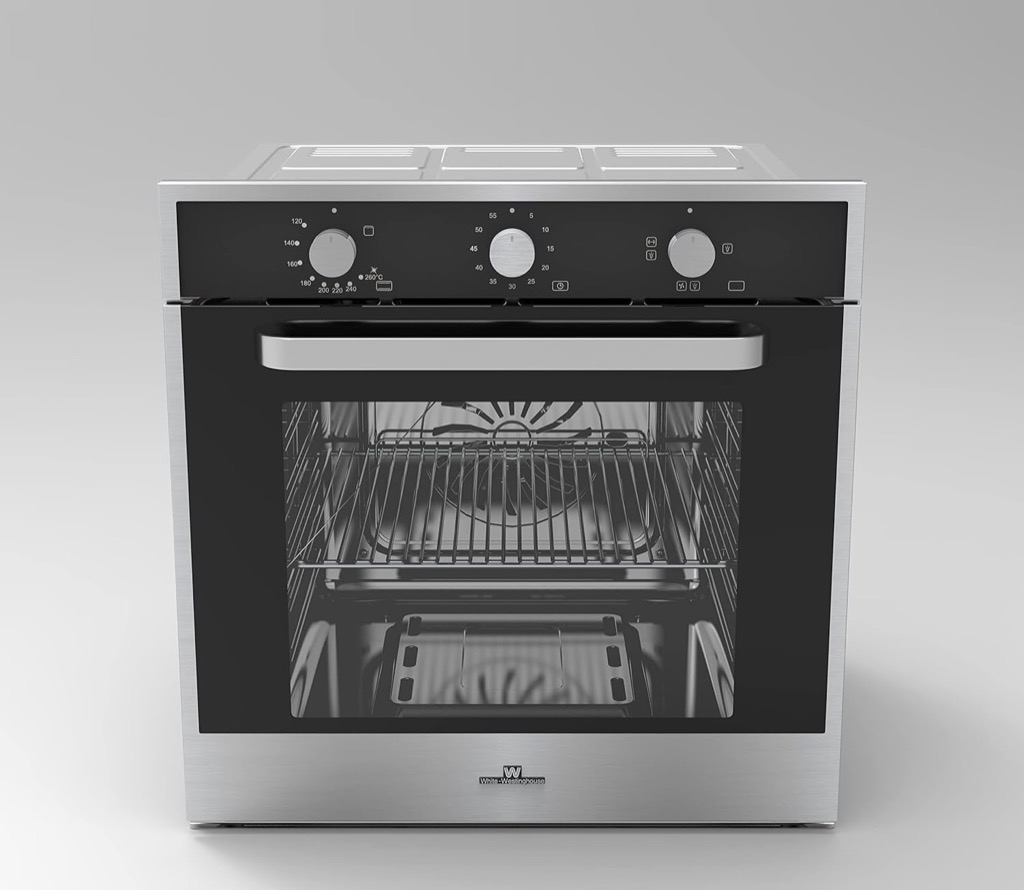 Brand: White Westinghouse Type: Oven Color: Black Material: Stainless Steel Model Number : WG-76N Size: 60 cm Capacity: 76 Liter Heating Element: Cast Iron Easy to Clean Multiple Programs 3 Layers of Glass Convection Black Glass Soft Close Door Gas Grill Cooling Fan