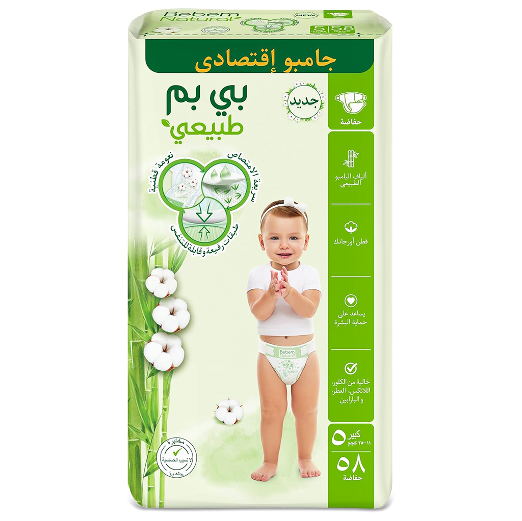 Bebem Natural Baby Diapers, Junior Size 5, 11-25 Kg - 58 Pieces | Almorshedy Marts