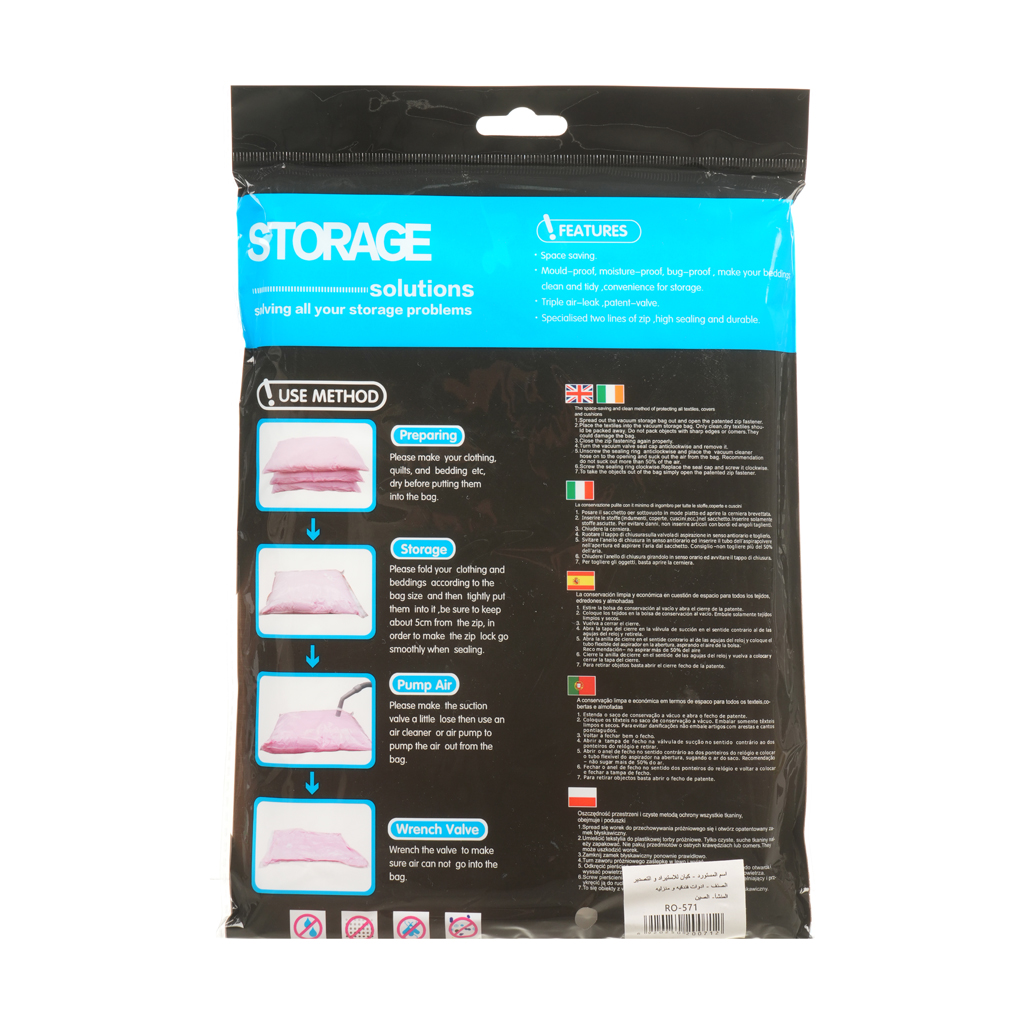 Brand: Other Type: Clothes Storage Bag Color: Multicolor Size: 70×120 cm About Product: Make sure to co-mple tely dry the clot-hing before they are saved in the vacuum bag otherwise it may resuit in Fold the cl-othing properly acco-raing to the size of the bag before saving them in the bag. Clean the seal in case any odd object should allow air into the bag. Clip one end of the seal with a bag clip ang pull the clip smoothly toward the other end. Save just enou-gh room for the tip about 10 cm) of the vacuum cleaner place the tip inside the bag to take all the air out. To compress with hand push the body of the bag to drive out the air inside before pulling up the double zipper.