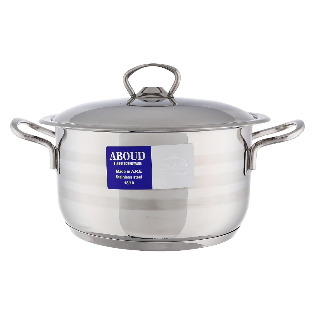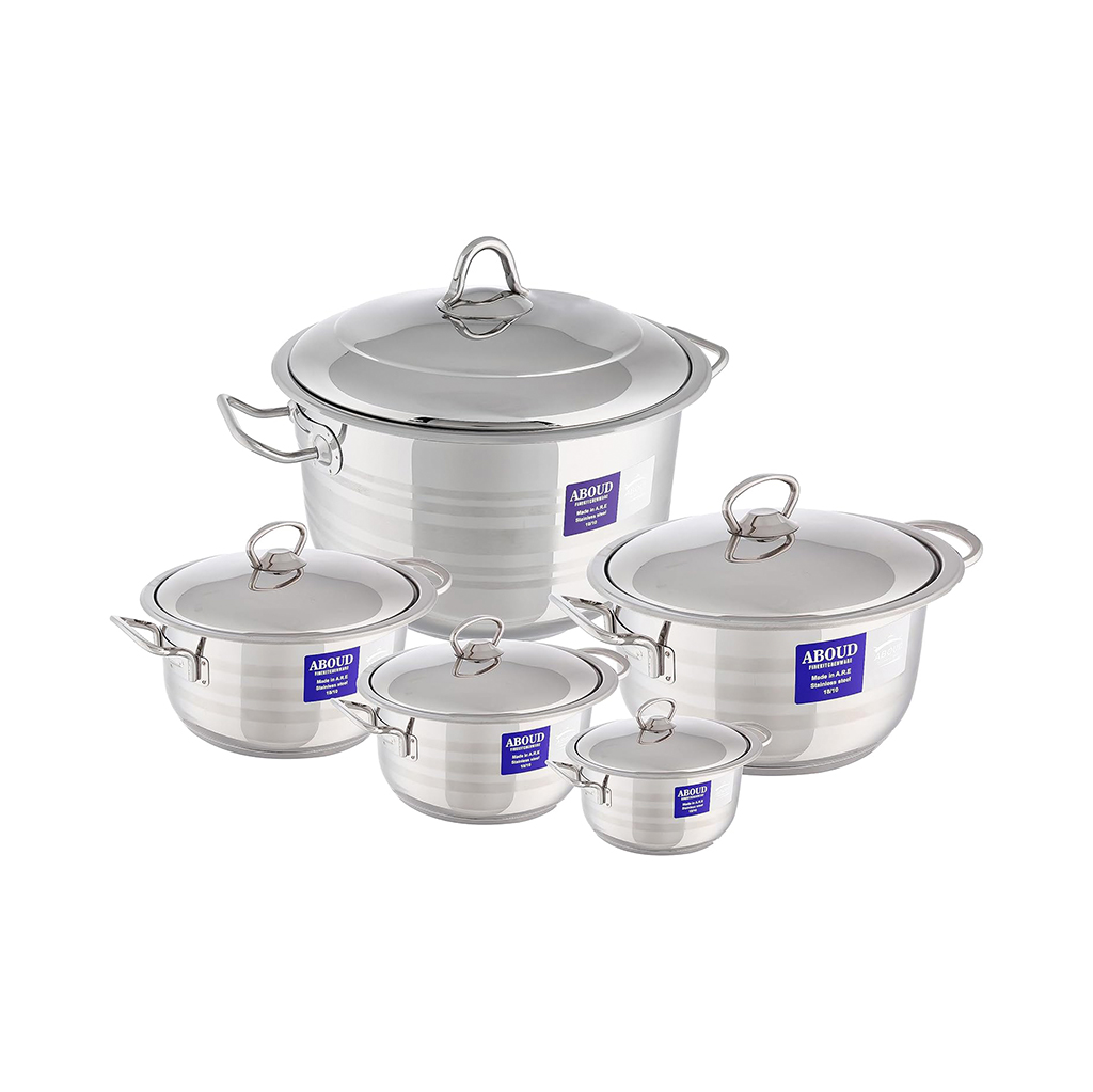 Brand: Aboud Type: Cookware Set Material: Stainless Steel Number Of Pieces: 10 Pieces Color: Silver Consists Of: Cooking Pot Size 16 cm Cooking Pot Size 18 cm Cooking Pot Size 20 cm Cooking Pot Size 24 cm Cooking Pot Size 28 cm High Durability and Strength: Resistant to scratches and impacts, ensuring long-lasting use even with heavy daily cooking. Elegant and Modern Design: Provides a shiny and attractive look to your kitchen. Rust and Corrosion Resistant: Rust-resistant properties make it suitable for everyday use and various cooking conditions.