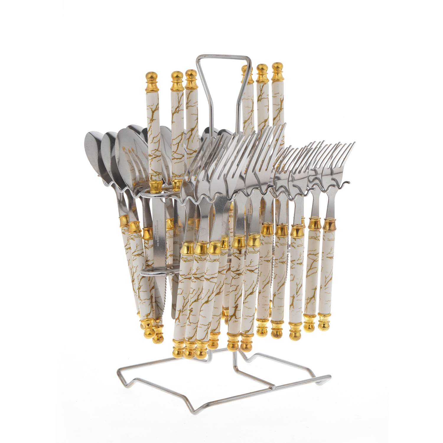 Brand: El Shahd Type: Dinnerware Utensils Set Color: Beige Gold Material: Stainless Steel Number Of Pieces: 30 Pieces Composed Of: 6 Dinner Spoons 6 Dinner Forks 6 Dinner Knives 6 Tea Spoons 6 Dessert Forks