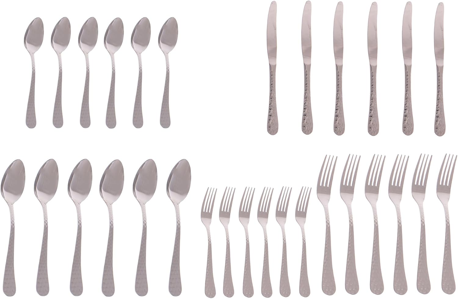 Brand: Zinnia Type: Dinnerware Utensils Set Color: Silver Number of pieces: 30 Pieces Material: Stainless Steel Made of high-quality stainless steel material Features a stylish reflective exterior Perfect for serving desserts or appetizers Adds a touch of elegance to any dining setting Handles provide a comfortable and secure grip 6 Dinner Knives 6 Dinner Forks 6 Dinner Spoons 6 Cake Forks 6 Teaspoons