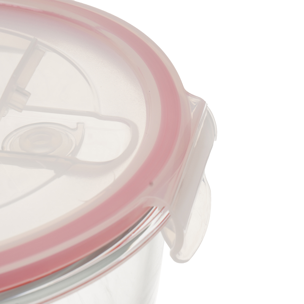Brand: Pedrini Type: Round Food Container Color: Clear Rose Material: Glass Number Of Pieces: 1 Piece Size: 650 ml Resistant to heat and cold up to 40°C. Suitable for use in the refrigerator and freezer. Microwave safe when using the vent valve. Remove the lid before using in the oven. Comes with a tightly sealed, leak-proof lid.