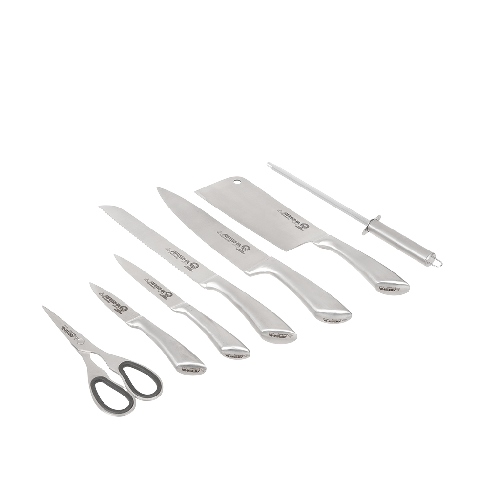 Brand: Arsha Type: Knives Set Color: Silver Black Material: Stainless Steel Number Of Pieces: 8 Pieces With Stand Consists Of: 1 Cleaver 1 Chef Knife 1 Bread Knife 1 Utilty Knife 1 Paring Knife 1 Scissors 1 Steel Sharpening • After Using Knife, Wash And Dry Immediately With A Dry Cloth • For Longer Life On The Knife, Do Not Use It On Glass Or Ceramic Worktop • For Safety, Do Not Take It By Hand, When Knife Drop Down. • Do Not Test Sharp By Finger • Keep And Stored Knife Away From Children Easy To Reach.